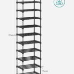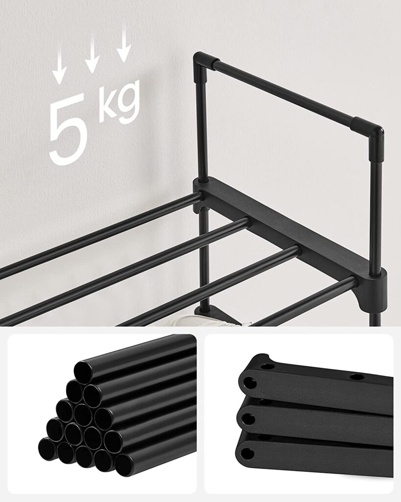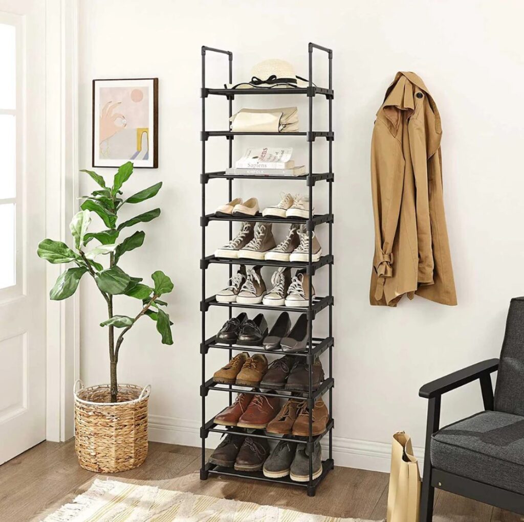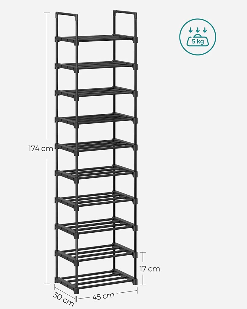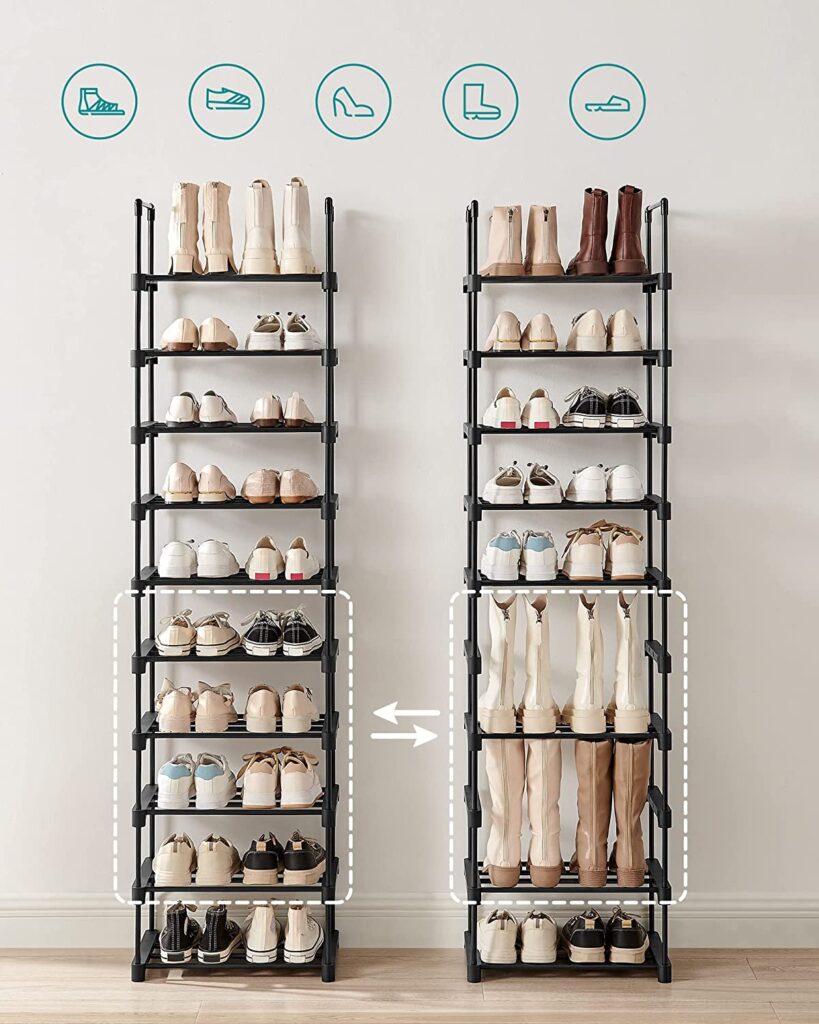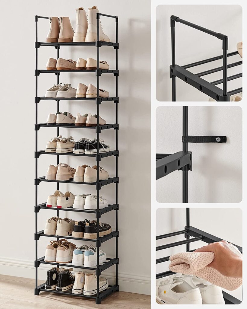 Овој организатор за чевли има на располагање 10 полици. Не се потребни алатки, се што треба да направите е да ги вметнете металните цевки во квалитетните пластични конектори! И ќе можете веднаш да почнете да ги редите вашите папучи, патики, високи потпетици, сандали и балетанки.