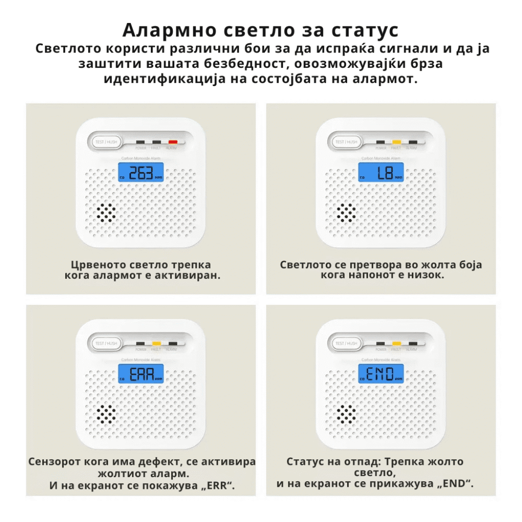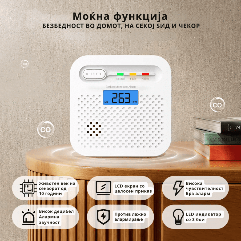 Јаглерод моноксидот (CO) е невидлив и без мирис, но многу опасен гас кој може да предизвика сериозни здравствени проблеми или смрт. Алармот за јаглерод моноксид обезбедува навремено предупредување со гласен звучен и светлосен сигнал, заштитувајќи ги семејствата, станарите и гостите од труење. Идеален е за домови, станови, хотели и деловни простори.