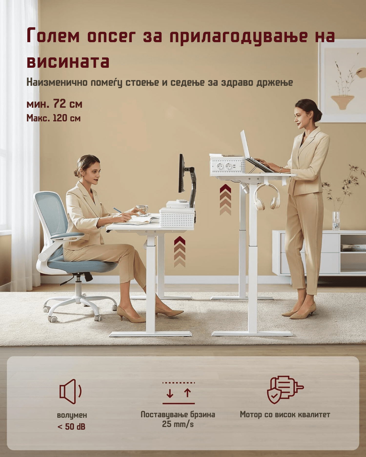 Електрично биро со прилагодлива висина помеѓу 72 и 120 см. Седење или стоење? Најдете ја идеална положба; исто така бирото има вкупно 3 висини како брзо поставување.