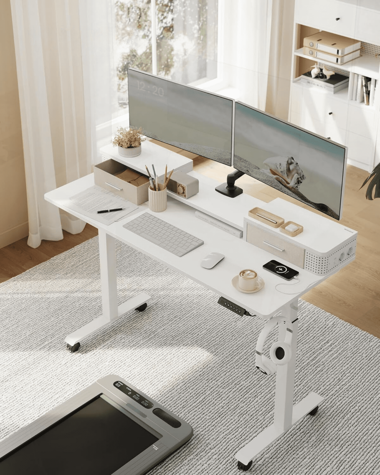 Средната полица на држачот на мониторот е прилагодлива во висина; на двете страни има 2 фиоки; перфорирани плочи за криење кабли и 2 AC приклучоци и 2 USB порти за полнење.