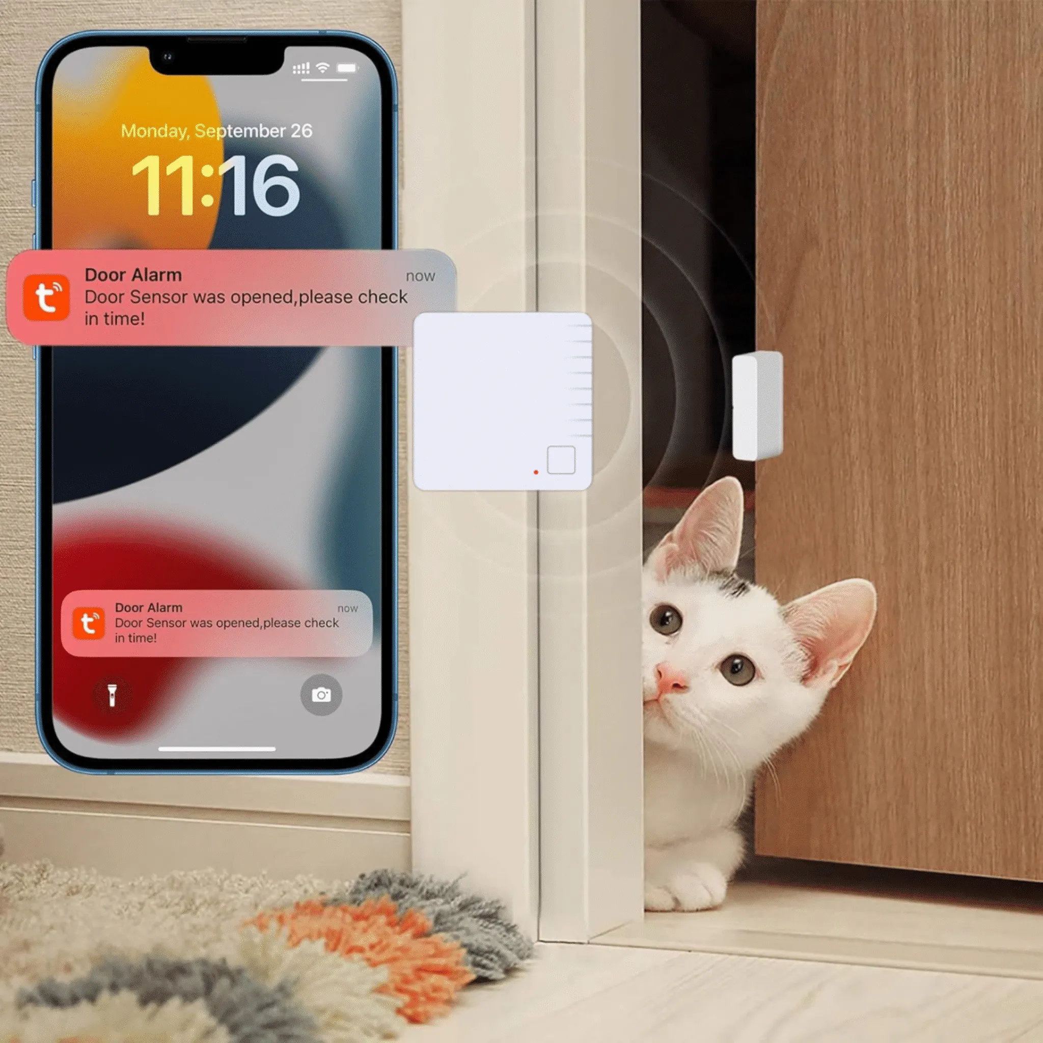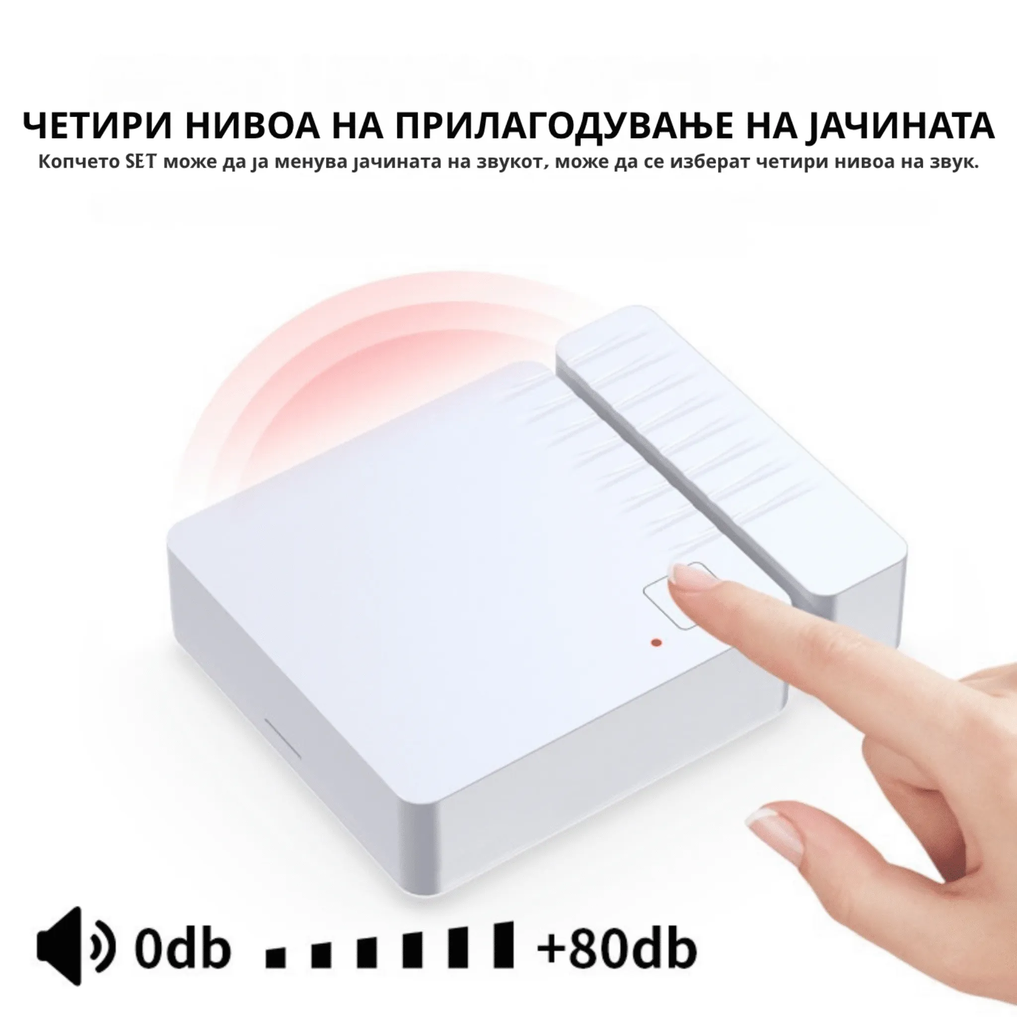 Режим (Аларм): Активирај го кога излезеш од просторијата – секогаш кога се отвори вратата или прозорецот веднаш се вклучува гласен аларм, и ти испраќа известување на телефонот кога си надвор, така ќе го заштити домот или просторијата, совршен и за канцеларии, продавници, за домови со стари лица.