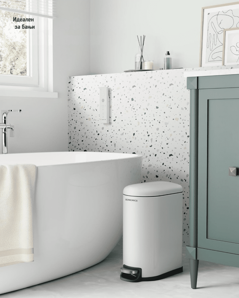 Со тенок профил и елегантен бел финиш, корпата за ѓубре од 10 литри е паметен додаток во вашиот дом кој ќе одржува сè уредно.
