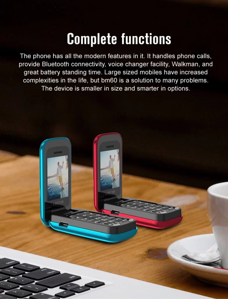 Микро SD со максимум 32 GB : Уредот може да ракува со микро SD со максимална граница од 32 GB. Малиот и паметен уред може да ги направи достапни сите главни карактеристики на големиот телефон. Неговиот екран е мал, но е во боја, а управувањето со bm60 телефонот е забавно со мали димензии и флип-флоп. BM60 обезбедува работа од 3 дена, во мирување, екран во боја од 1,14 FTF, капацитетот до 32G, вградената функција за магичен звук, FM Радио, за задоволување на потребите на корисниците.