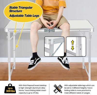 Оваа маса за преклопување може да се користи како трпеза за пикник, маса за послужување, маса за игри, трпезариска маса на отворено. Совршено за излети, плажи, забави, риболов, кампување, концерти на отворено и многу повеќе.