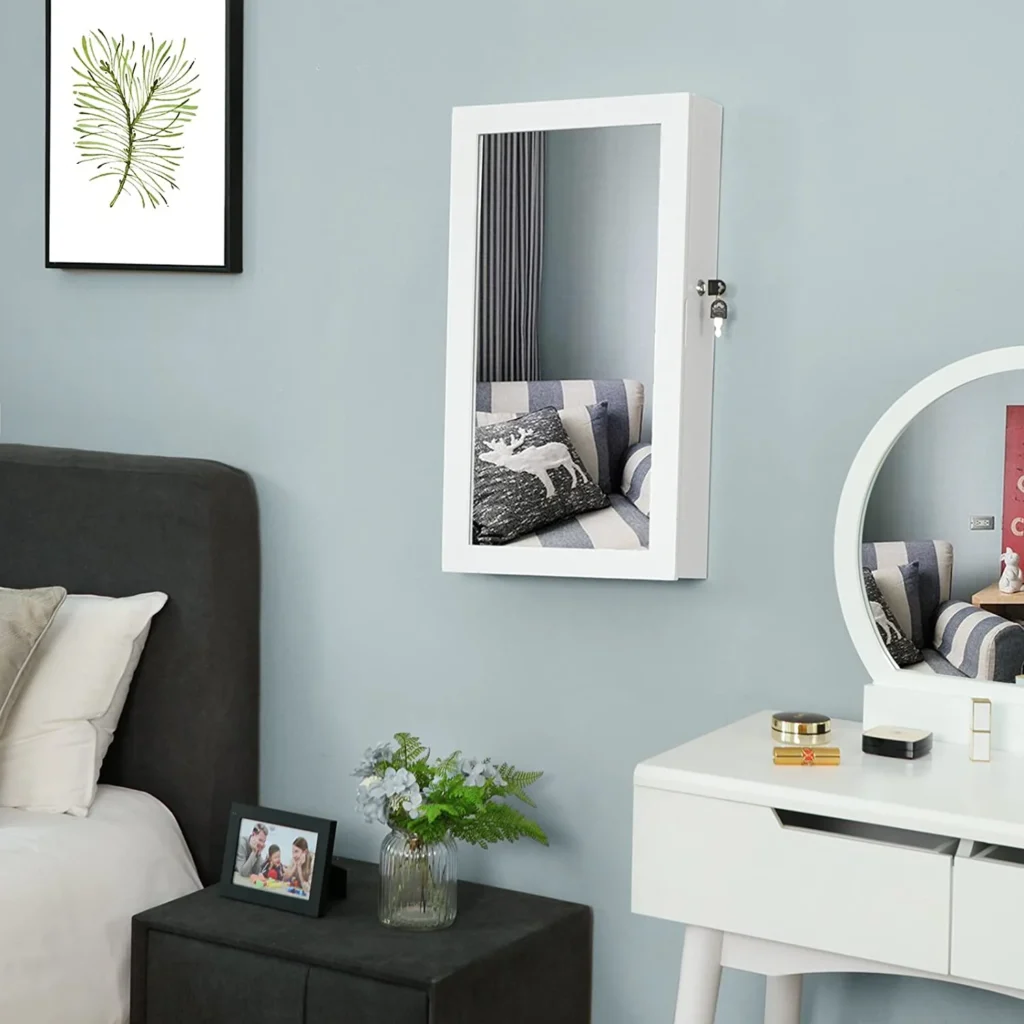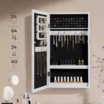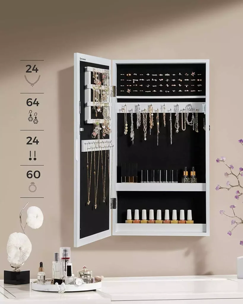 Овој шкаф за накит на SONGMICS има разновидна употреба која може да ги задоволи сите ваши различни потреби. Со 2 меѓуслојни слоеви, 65 рамки за прстени, 64 куки за обетки, 24 држачи за обетки, 24 куки за ѓердан, има голем капацитет за уредно складирање на вашите предмети. Со странична брава на вратата и 2 клуча. Така, SONGMICS шкафот за накит со огледало за на ѕид/прицврстување е идеален за да го организирате вашиот накит.