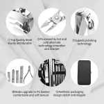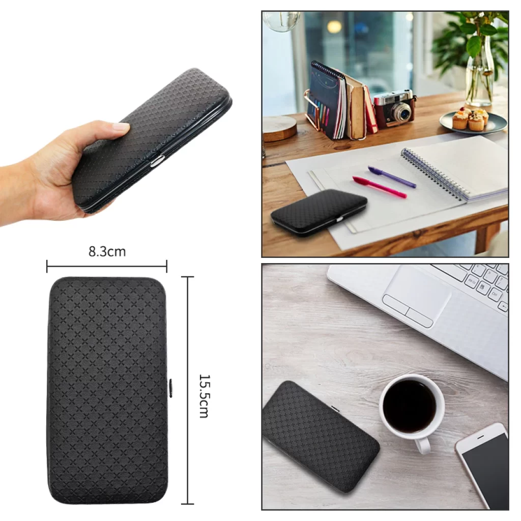 Комплетот за маникир доаѓа со пренослива футрола од синтетичка кожа која лесно се отвора со притискање на копче. Исто така е многу лесен за да можете да го носите со себе во вашата торба секој ден или да го спакувате со себе кога одите на патување.