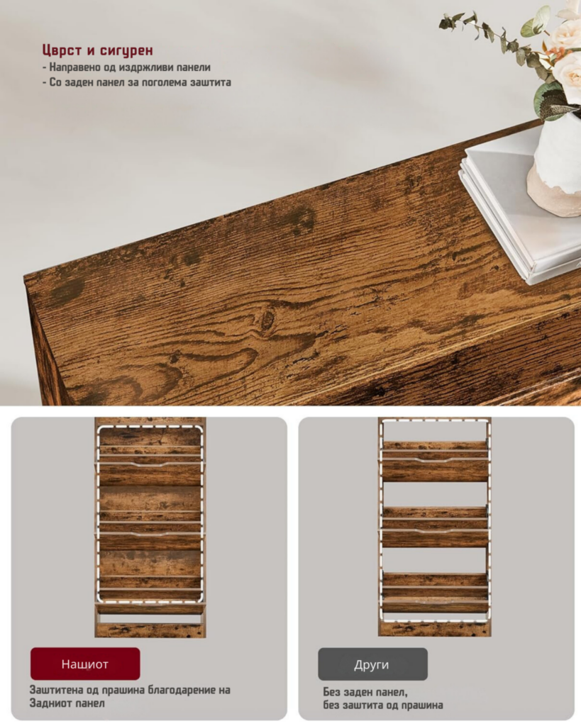 Потпрете се на издржливоста: Направена од висококвалитетни, цврсти панели и опремена со заден ѕид за заштита од прашина и инсекти, оваа полица за чевли е безбедно засолниште за вашите чевли.