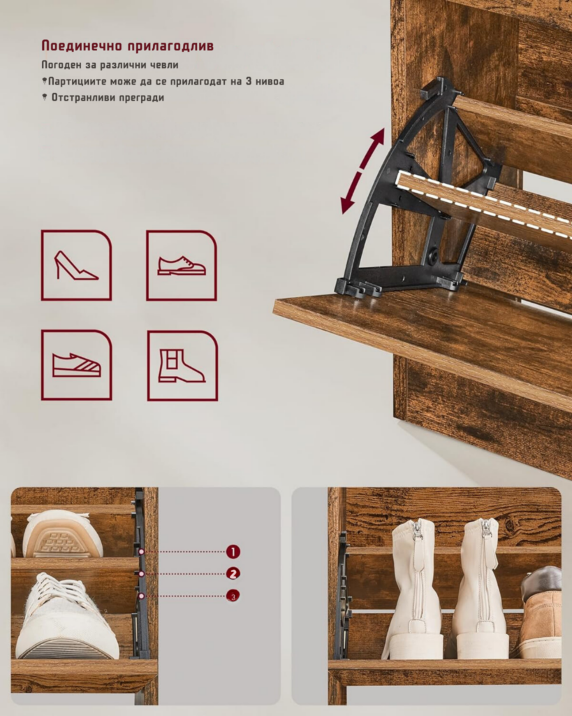 Прилагодлив и заштедува простор: со отстранливи и 3-насочни прилагодливи прегради, овој ормар за чевли може целосно да се прилагоди на вашите потреби и различни типови на чевли.