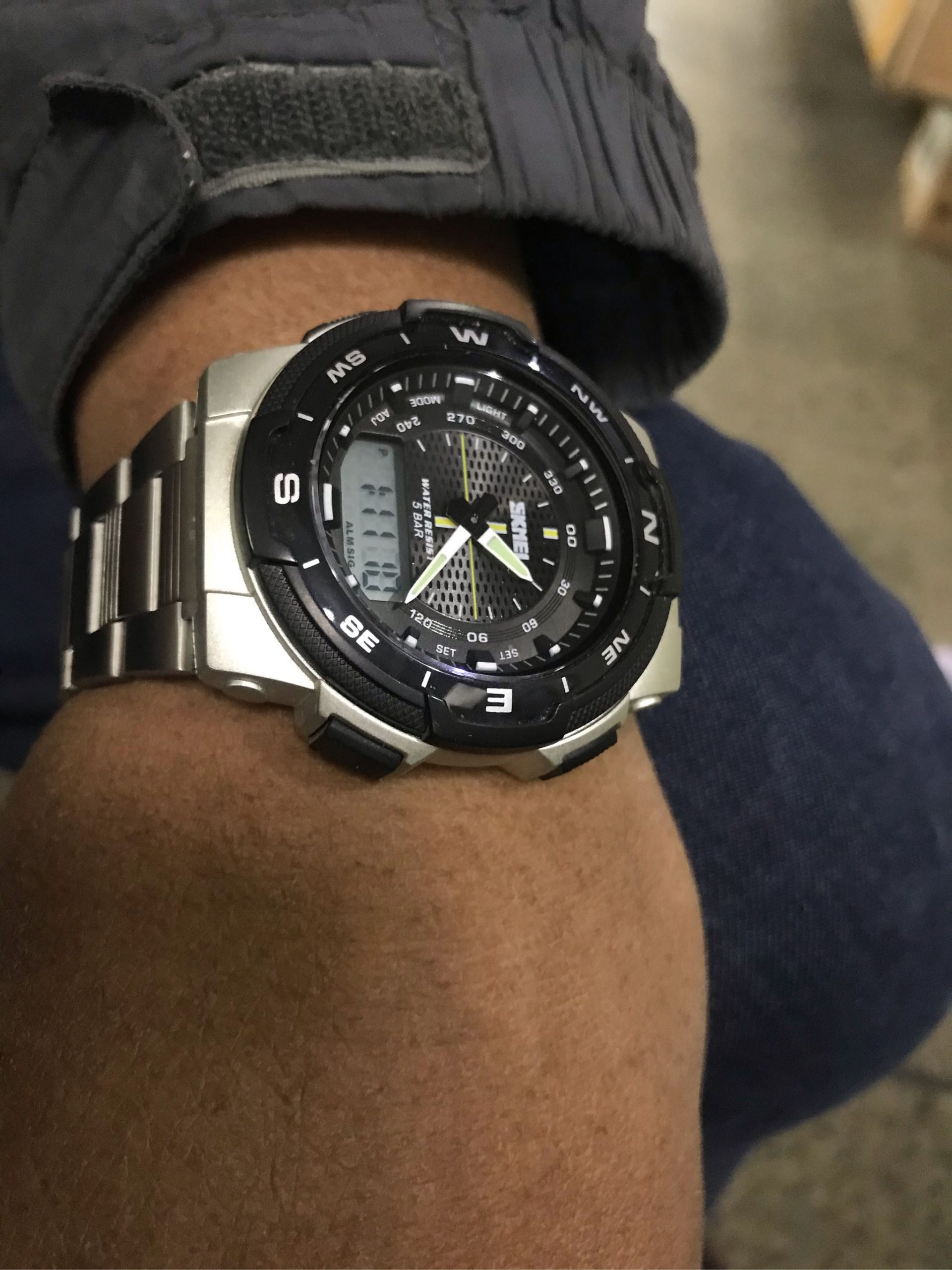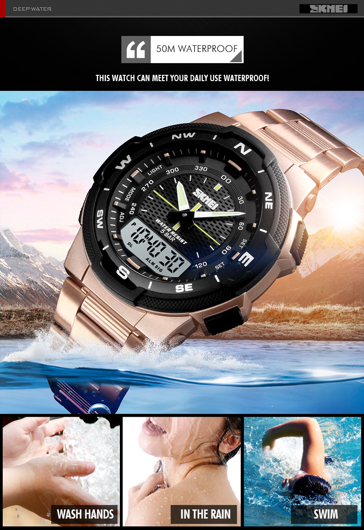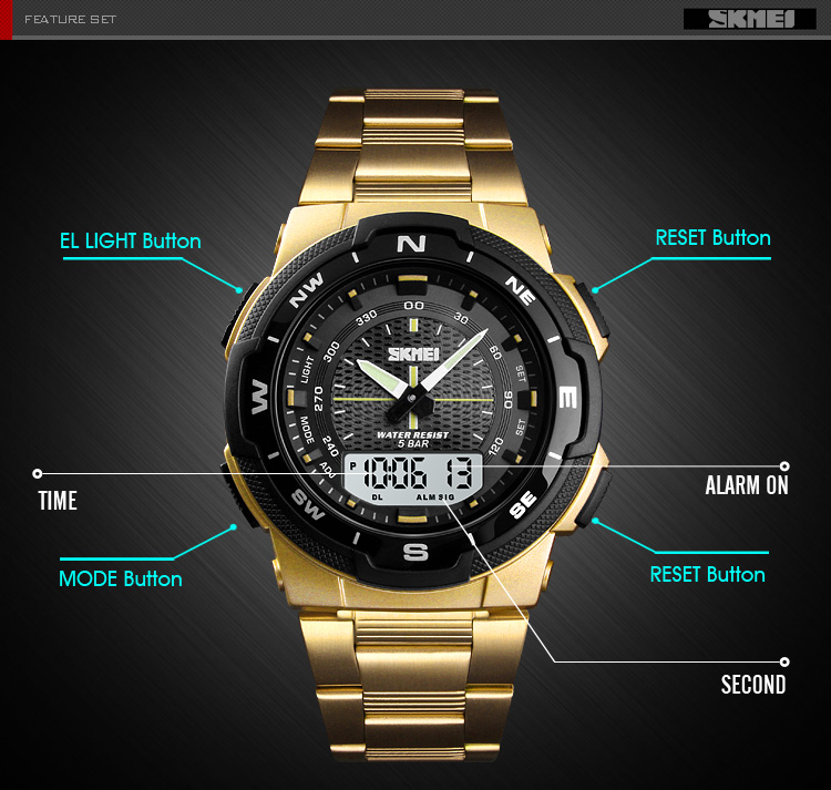 Функции: 5bar Отпорен на вода / Датум / Стоперица / Двојно време / Недела / EL светло / Аларм / 12/24 часа.