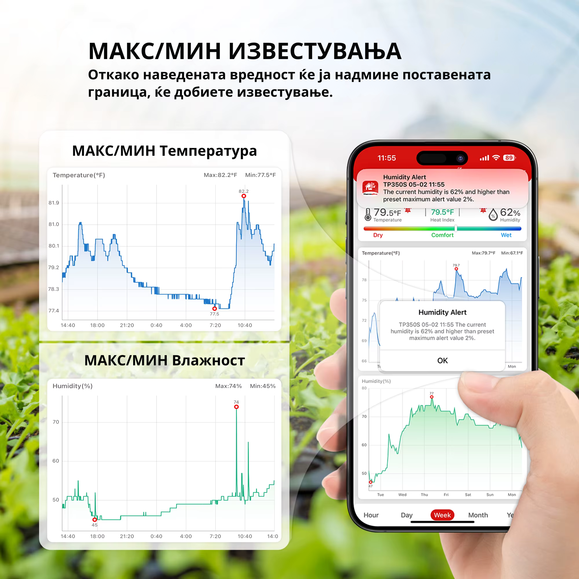 ThermoPro TP350 е совршен за следење на температурата и влажноста во секоја просторија: спални, детски соби, музички простории, градини или складишта. Создадете идеални услови за вашите потреби и заштитете го и комфорот и вашите вредни предмети.