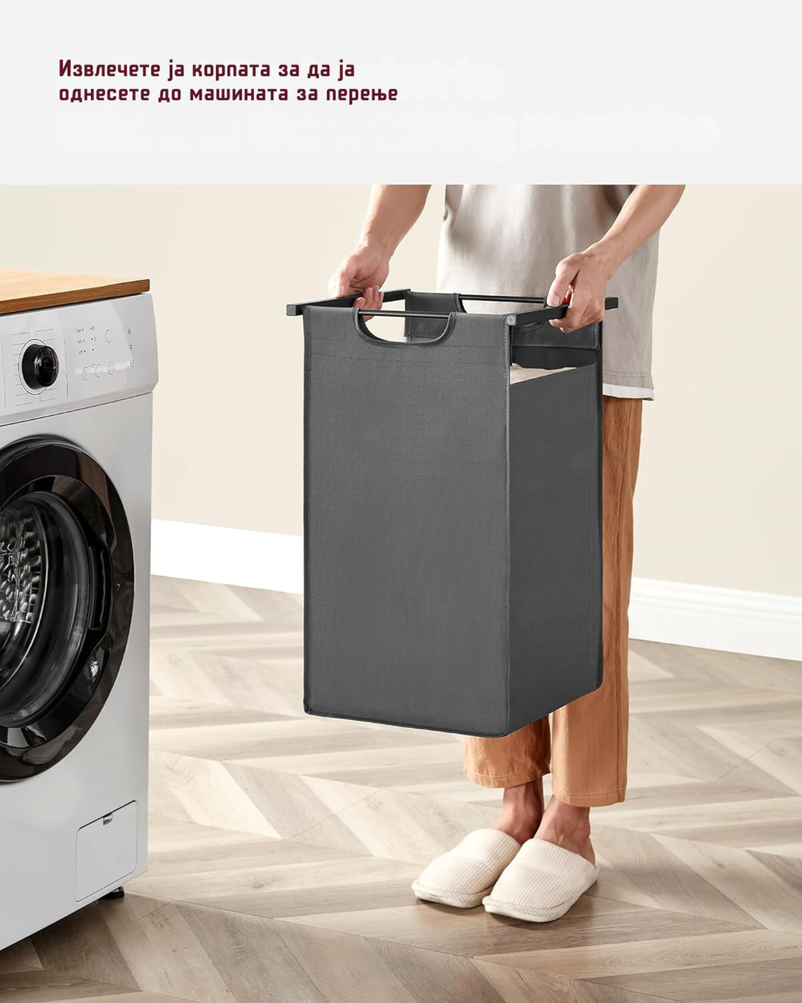 Толку многу опции за складирање…што оваа корпа за алишта може да ви понуди! Два џебови направени од Оксфордска ткаенина кои ви помагаат да ги сортирате алиштата по боја, а горната полица ги држи при рака детергентите, пешкирите и омекнувачот.