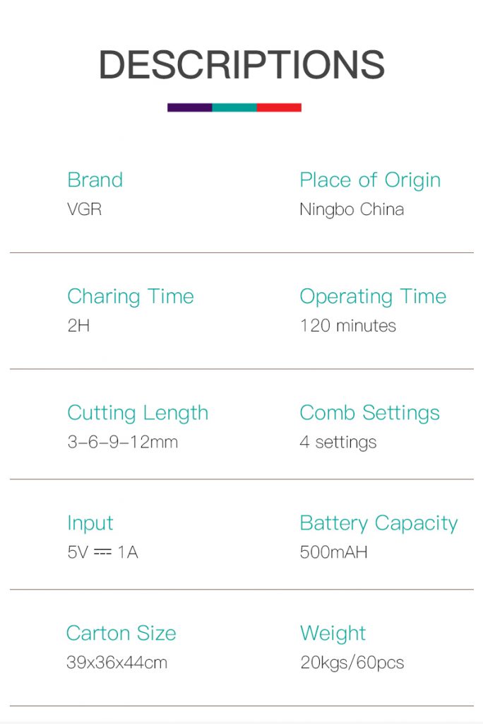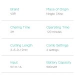 Пакет вклучува: 1 машинка, 4 додатоци (3, 6, 9, 12 mm), 1 USB кабел за полнење, 1 четка за чистење, 1 масло за подмачкување, 1 упатство за корисник.
