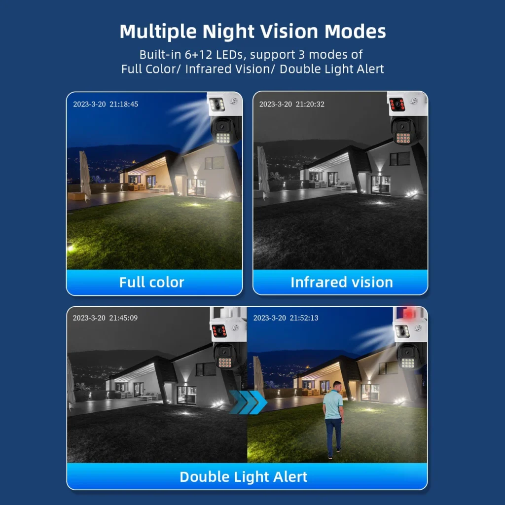 поддржува режим на целосна боја, инфрацрвен режим и режим на предупредување со двојно светло (инфрацрвено ноќно гледање се прикажува кога не се движи ниту еден предмет, а белото светло ќе се вклучи за да се префрли во режим на целосна боја откако ќе се открие движење).